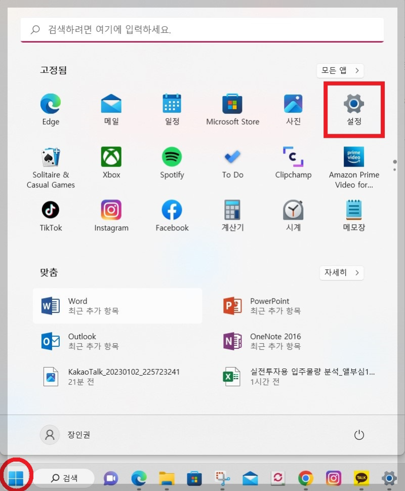 1. 원도우11(Window 11)을 버전입니다. 시작(원도우 마크) 클릭 후 설정을 클릭합니다.